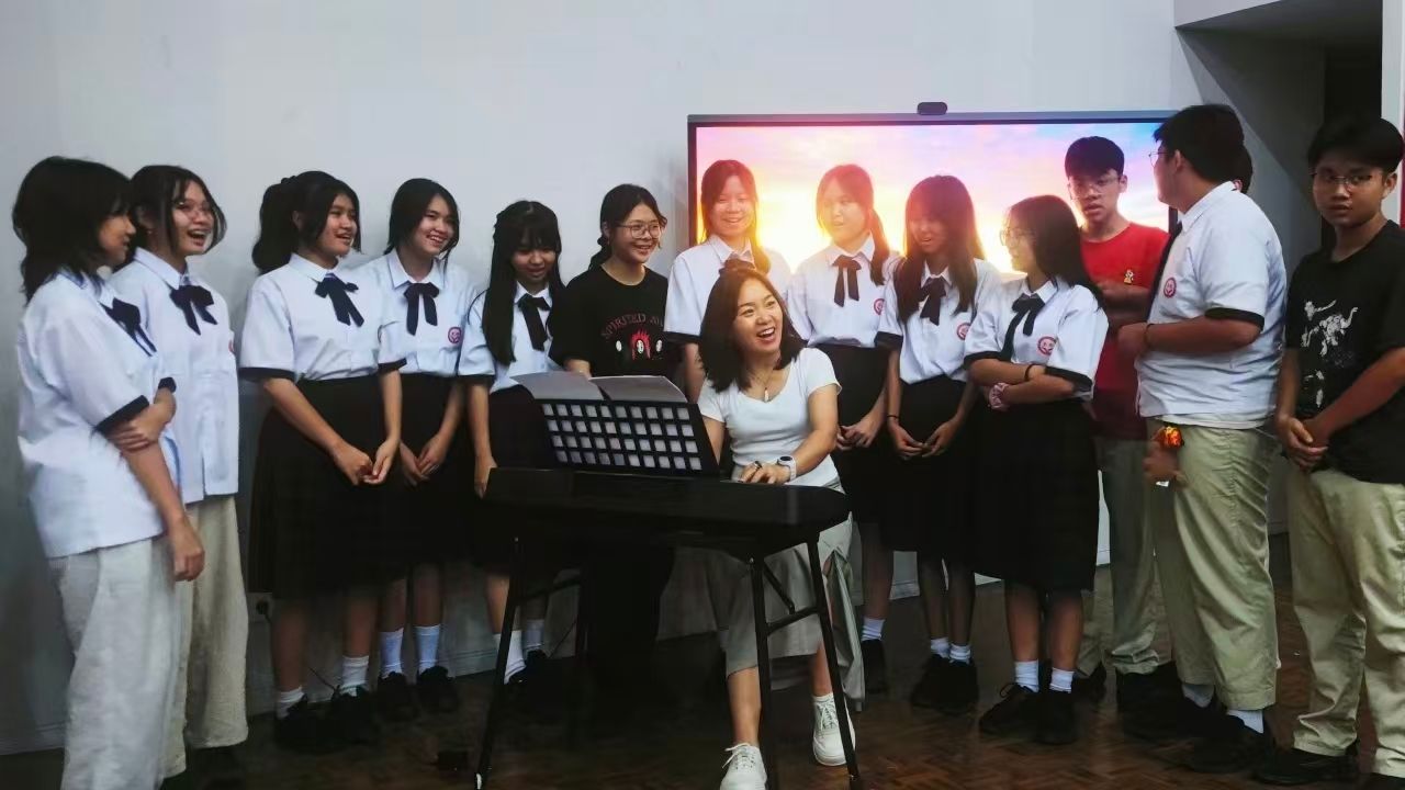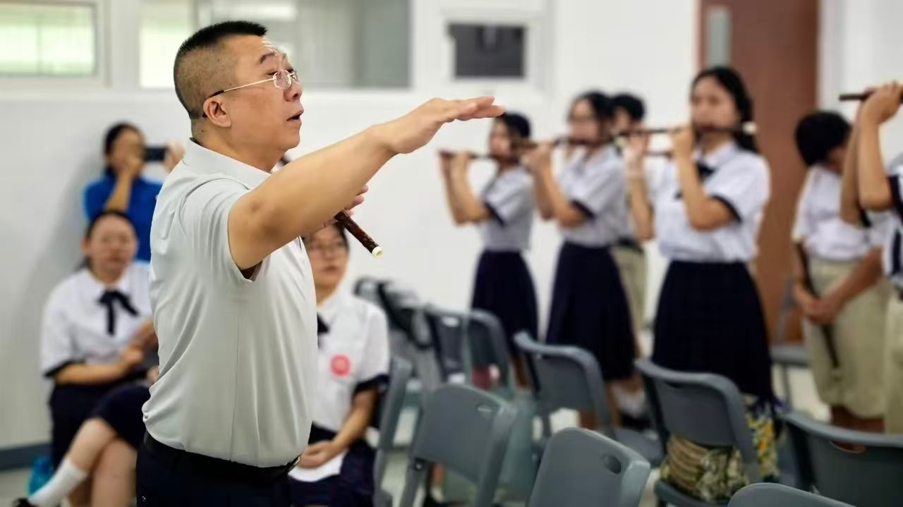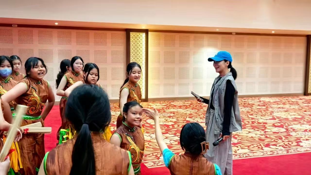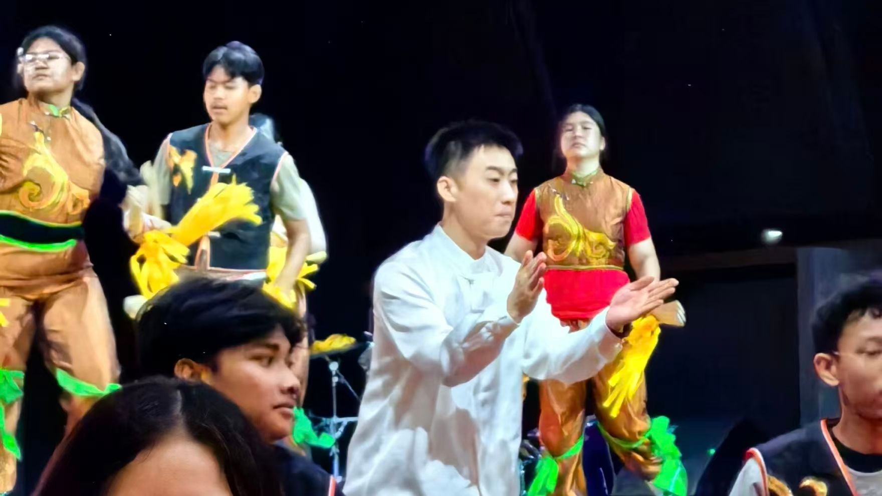教师将“教学传艺”与“舞台展演”紧密结合:在教学环节,针对性开设山西民歌、竹笛演奏、翼城浑身板等课程,通过逐句教唱、技法拆解等方式,让印尼学生从初识到掌握基础演绎,推动中国传统文化落地生根。在汇报演出中,带来山西民歌联唱《交城山》《大红公鸡毛腿腿》,展现山西文化质朴热情;竹笛齐奏《我和你》,以笛声传递中印尼绵长友谊;合唱《采茶扑蝶》带观众领略了江南采茶的诗意与灵秀。在民族音乐与舞蹈交流环节,中国教师与印尼教师互教互学,不仅呈现了《庆丰收》山西翼城浑身板表演,明快鼓点、灵动舞姿再现丰收盛景,还共同演绎了印尼舞蹈与中国民族舞蹈,以多元艺术形式全方位展现中华文化魅力,彰显中外艺术交融之美。