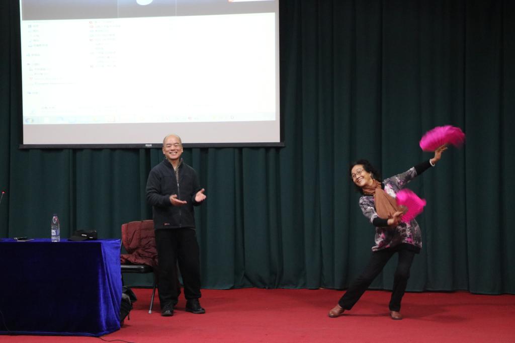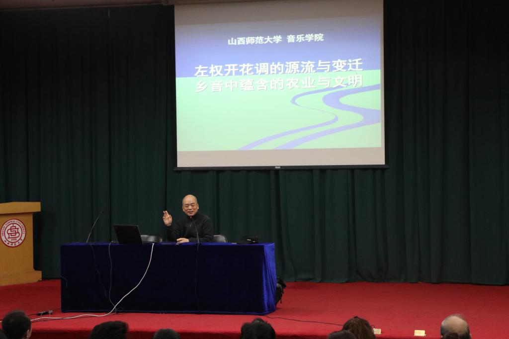 报告中,刘红庆研究员就左权音乐最具代表性的传统民歌开花调做了详细的介绍,用通俗的语言细致地向在座的老师、同学进行讲解,使得同学们更深入的认识了左权开花调的发展现状。接着,他向大家介绍了四名左权县优秀的民间艺术家,分别是:刘改鱼、李明珍、石占明和刘红权,这四人为左权盲人宣传队的主唱。四名艺术家为台下的师生带来了精彩的左权开花调表演,赢得了阵阵掌声。随后,刘红庆研究员以具体的歌曲为例,从产生背景、艺术特色及演唱技巧等多方面为在场师生讲述左权开花调的源流与变迁。他现场指导传授演唱技巧,包括气息控制、情感诠释、表演姿态等方面的常识,并邀请李明珍和庞蓉老师为大家展示了小花戏的基本动作与在场师生互动交流。这些教学方式既有针对性和目的性,又不失亲切感,短短两个小时的报告,使台下的观众受益匪浅。