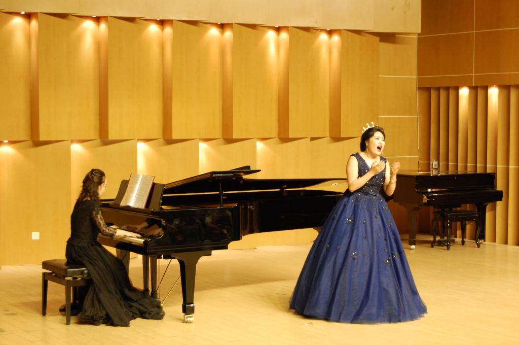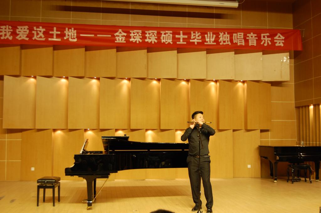 明灯微微笑,月儿偷偷瞧,思维的花朵烂漫开,这儿静悄悄。可为什么我的眼里常含泪水?因为我对这土地爱的深沉!”下半场开始金琛琛为大家带来了两首旋律优美的作品《这儿静悄悄》和《我爱这土地》。